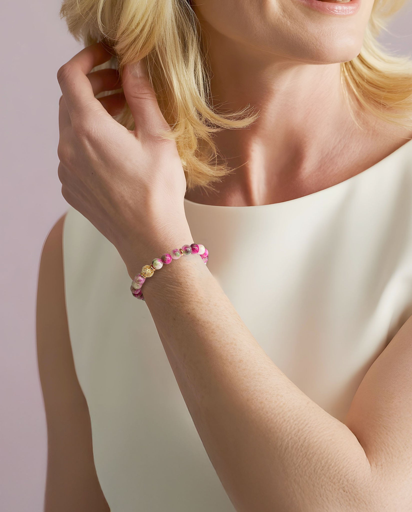 Vibrant de couleurs, le Jade pourpre et vert favorise sérénité et équilibre. Rehaussés d’une perle centrale plaqué or 18K, ce bracelet allie élégance et bienfaits intemporels.