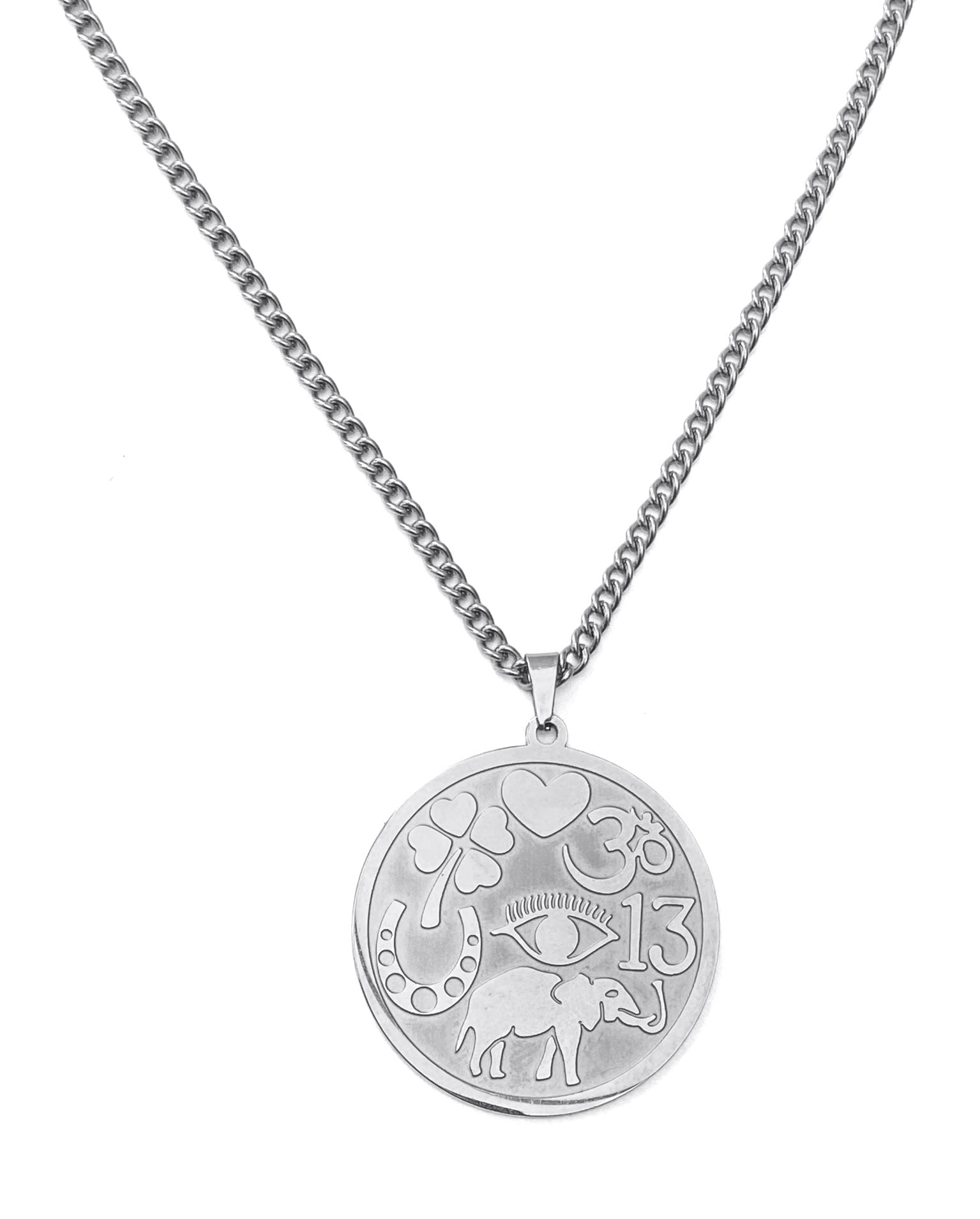 En acier inoxydable - Chaine fournie : long. 60 cm - Pendentif Ø 35 mm